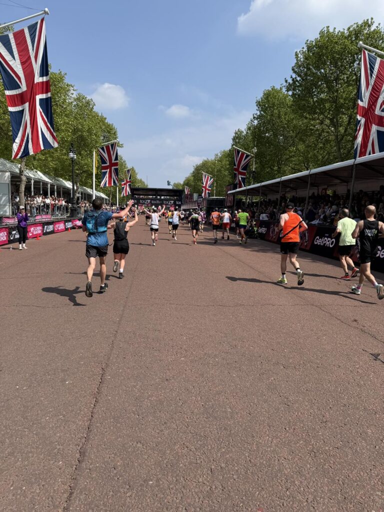 Um 9:40 Uhr ging es zunächst für Flo auf die Strecke. Bis 34 km lag er auf knappem Bestzeitenkurs, welchen er aufgrund von Temperaturen von über 20 Grad jedoch vernachlässigen musste. Er kam letztendlich mit einer Zeit von 3:19 Std. und damit nur knapp 5 min hinter seiner Bestzeit zufrieden ins Ziel am Buckingham Palace.